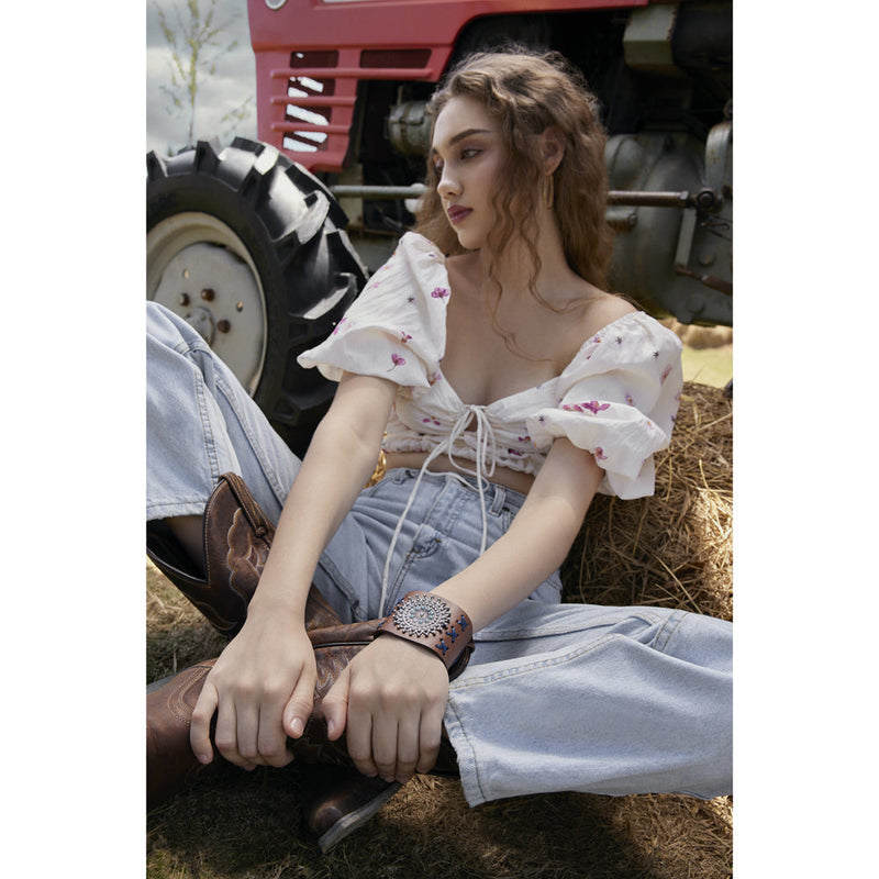 This beautiful cuff features a wonderful blend of artistry, including cross-stitch accents, and a stunning silver-toned medallion in a star field, blossom pattern with faux turquoise inlay.