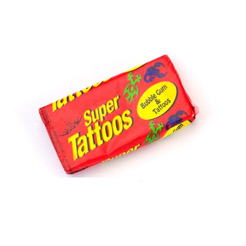 Super Tattoos - Bubble Gum and Tattoos. Individually wrapped pieces of bubble gum, each with a temporary tattoo enclosed. 40 different tattoo designs! This is a classic retro treat.